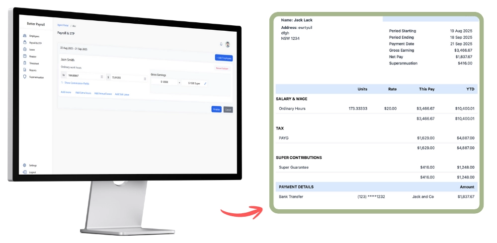 - Fast & Accurate: Within minutes, generate final payslips with accurate gross, PAYG, super, and net amounts without manual duplication.